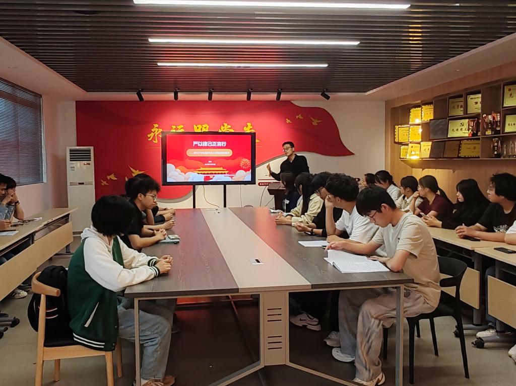 信管学生党支部在汇文楼A502开展“严以律己正言行——青年大学生落实中央八项规定精神宣讲”专题党课。党支部书记曹宇主讲,支部全体党员参加学习。