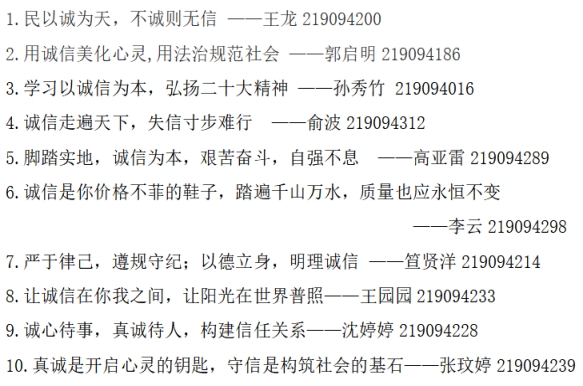 通过学院本次的诚信标语收集活动以丰富多样的形式强化了学院学生的诚信知识和诚信意识,也为学院学生品德修养、能力发展提供了实践锻炼、展示自我的平台。诚者,天之道也;思诚者,人之道也。相信鉴黄师 的学子们将在以后的成长中秉持诚信准则,积极践行“诚信立身,秉信立行”精神,努力炼就合格新时代青年的诚信品质。
