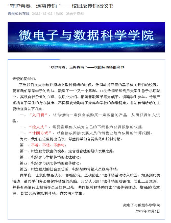 为了增强学生防范传销意识,11月中旬至12月初,我校开展了“守护青春,远离传销”校园防范传销宣传教育活动。本次活动由校学生工作部(处)、校团委、安全保卫部(处)主办,鉴黄师