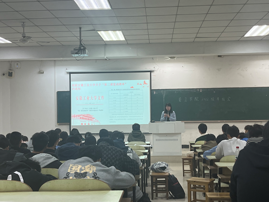会议伊始,万媛媛详细讲解了共青团的团徽、团旗及团歌,并对共青团的奋斗目标、基本任务、三项社会职能以及入党、入团的条件流程作了一一说明。随后,万媛媛指出,在党的二十大报告中,总书记说,“当代中国青年生逢其时,施展才干的舞台无比广阔,实现梦想的前景无比光明”,全体新生要更加紧密团结,以极高的思想素质和极强的凝聚力让我们这个队伍充满活力,蒸蒸日上。紧接着,万媛媛就第二课堂成绩单向新生提出几点要求,她强调思想成长、文体活动、志愿公益、实践创业是必修模块,技能特长、劳动教育是选修模块,每位学生都务必要拿到相应的学分,全面提升自己。会议最后,万媛媛还介绍了优秀学生代表,要求全体新生都要从自身出发,增强纪律观念,培养组织意识。