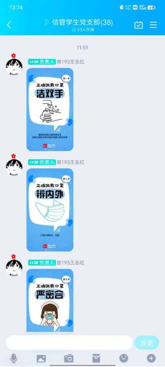 由于疫情特殊时刻,校园进行封闭管理且要求减少聚集,支部线下会议不能正常召开。支部书记刘瑜联合支部其他负责人钱琦、王志红等成员临时组建支部疫情防控宣传小组,在党支部的群里面向各位党员开展相关系列思想宣传工作。