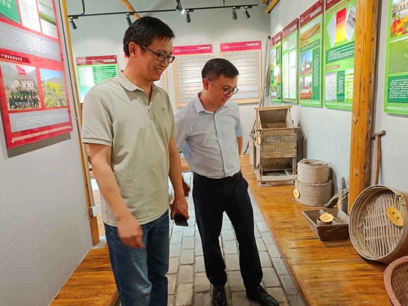 副院长郜振华与学院党委副书记王功成在参观田之源田园综合体中的农业发展历史展览馆