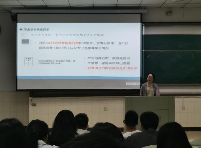 会上,钱丹丹围绕安全问题,提醒学生们提高防范意识,注意人身安全。同时提醒同学们对照专业培养方案,提前做好毕业资格核查。立足当下、踏踏实实做好学习规划,以良好姿态迎接每日生活。任静详细介绍了学校的就业招聘日程和相关就业政策,鼓励学生们要努力提升自身能力与技能,在准备考研的同时,不断了解当前的就业形势,多方位寻求合适工作,实现多元化就业。