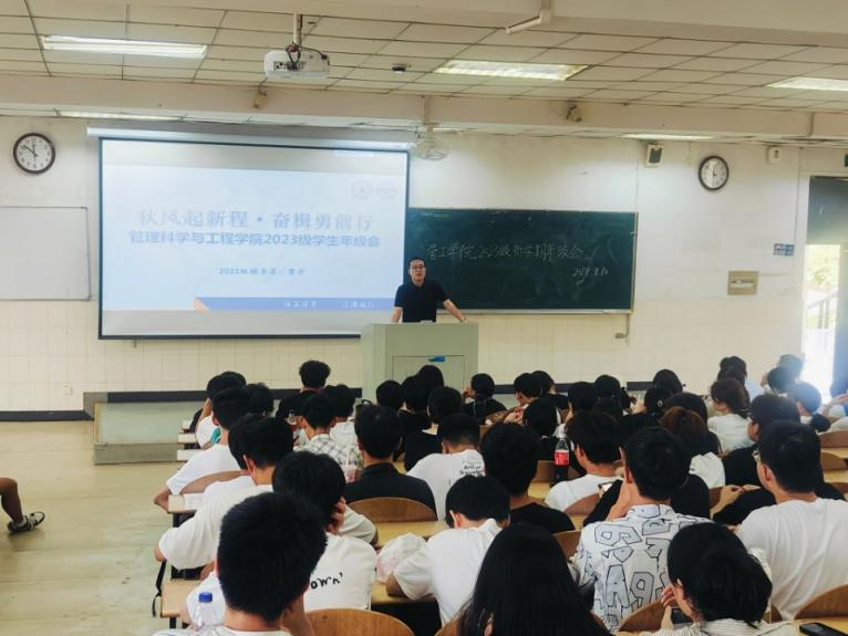 在阶教101召开以“秋风起新程,奋楫勇前行”为主题的2023级学生年级会。会议由辅导员曹宇主持,2023级全体学生参加此次大会。