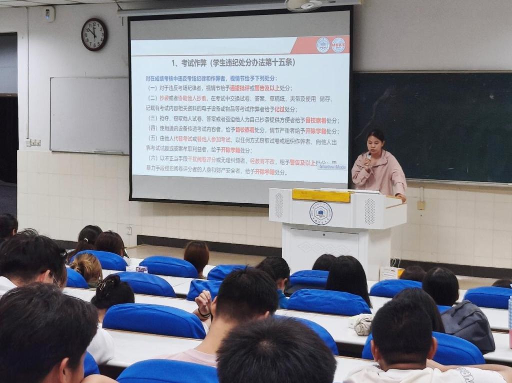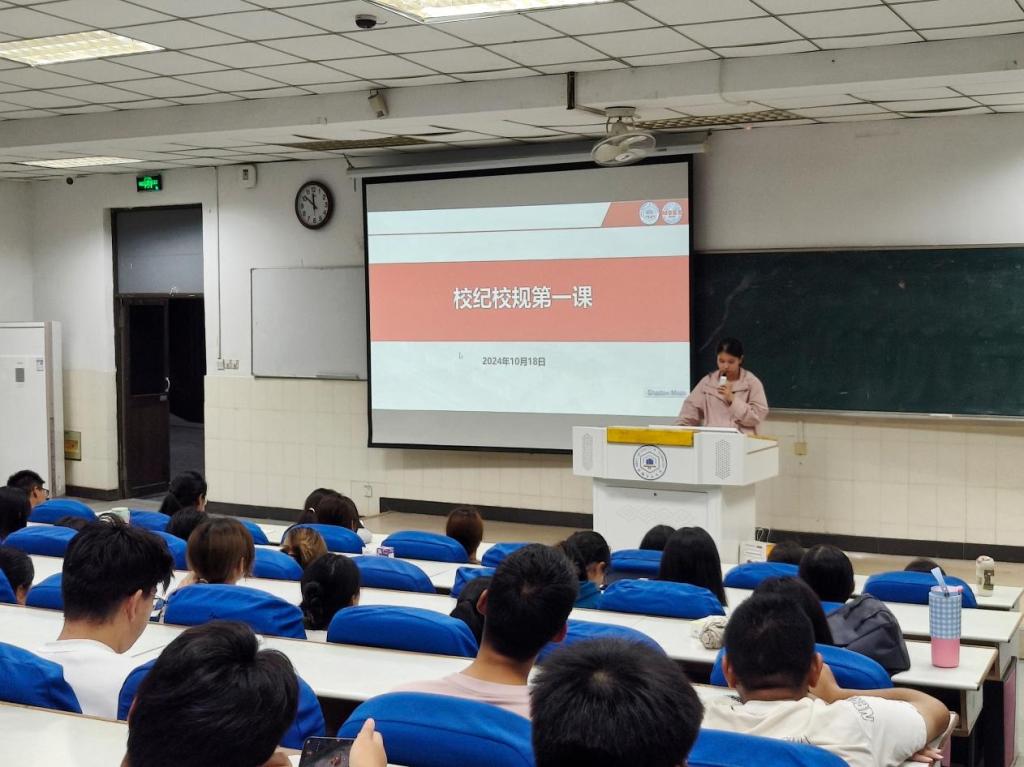 于阶教101开展校纪校规第一课,2024级辅导员李军慧、孙如梦及全体2024级新生参与。
