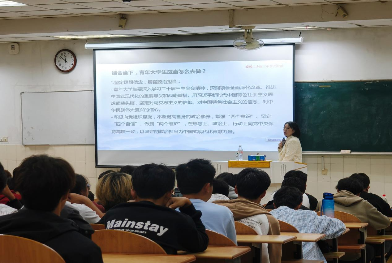 赵颖从深刻认识党的二十届三中全会的重大意义、全面准确把握党的二十届三中全会的精神内涵、作为新时代大学生应如何贯彻落实好全会精神等三个方面进行了详细介绍、深入讲解。要求学生们深刻理解并切实把增强理论的过程转化为日常学习的过程,把个人理想追求融入党和国家事业当中。同时,赵颖从经济体制改革、民主和法治领域改革、文化体制机制改革、生态文明体制改革、国家安全和社会治理体制机制改革、国防和军队改革、党的领导和党的建设制度改革等八个方面具体论述了党的二十届三中全会的精神内涵。