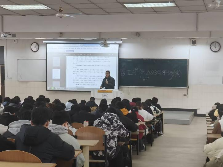 在阶教101召开以“行而不辍,奋楫争先”为主题的2023级学风建设—安全稳定大会。会议由辅导员曹宇主持,2023级全体学生参加。