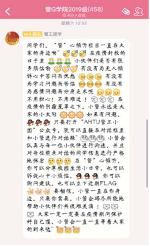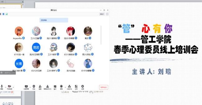 学院在充分宣传学校线上心理咨询渠道的基础上,在各年级群、各班级群以及学院QQ、微信平台上推送《乐观应对疫情,做好心理防护》等稿件数十篇,在普及心理健康知识和理念的同时,帮助广大同学更好的应对疫情下的学习和生活。学院心理工作站负责人刘瑜老师,集中组织学院心理委员和学生会心理部成员开展主题为“‘管’心有你”的线上心理健康教育培训,提出心理委员要充当好心理隐患“排雷兵”的角色,擅于发现及时关注以及介绍了关怀他人的技巧。并结合春季易发生心理疾病的原因进行分析,提出了相应的调适方法。此外,学院还充分利用校外资,通过中国大学MOOC平台开展《爱情心理学》线上培训,顺应学生心理发展需求,帮助学生树立正确的恋爱观。学院还在疫情防控期间开展多次线上观影活动,观看在学生群体中引起良好反响,同学们纷纷自发地写下自己的心理感受,在学院多媒体平台上进行分享。