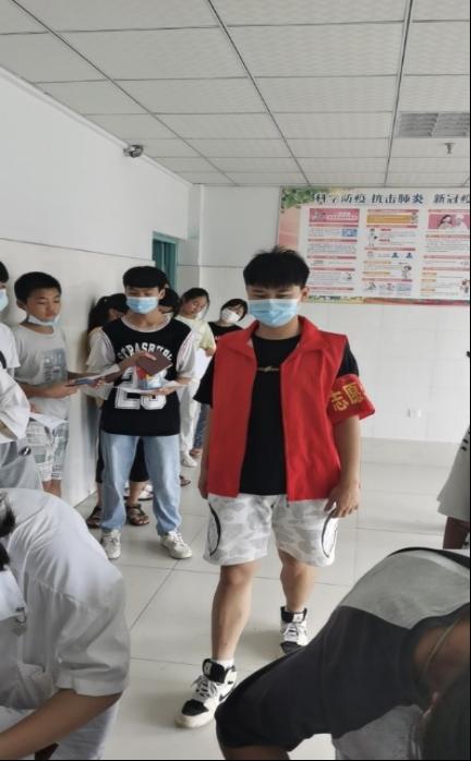李卓然是学院物流工程专业201班的学生,家住安徽省淮北市百善镇。今年暑假回家以后疫情突然再次袭来,看到每天为了防疫工作奔忙的医务人员,李卓然毅然选择为家乡的防疫工作尽一份绵薄之力。于是,他火速报名成为了一名防疫行动中的青年志愿者。8月3日,在安徽省淮北市百善镇卫生医院内,他有条不紊地维持着秩序,并为被接种人员普及打疫苗后的注意事项。当天该院的疫苗接种工作,也因医护人员和李卓然等志愿者们的共同维护管理而井井有条、过程顺利。