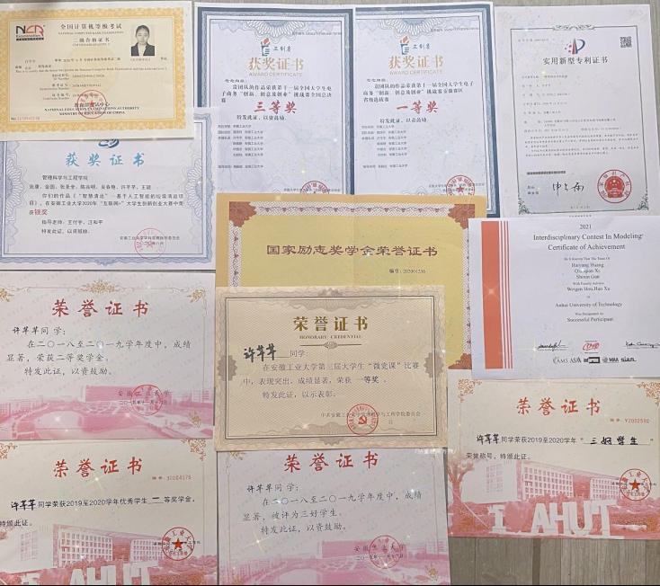 2020 年“互联网+”大学生创新创业大赛银奖、第十届全国大学生电子商务“创新、创意、创业”挑战赛校二等奖,拥有校三好学生(2次)、校优秀班干等荣誉称号。发表有论文2篇,授权发明专利1项(实用新型专利)。现已成功获取推免名额,保送至华东师范大学攻读硕士研究生。