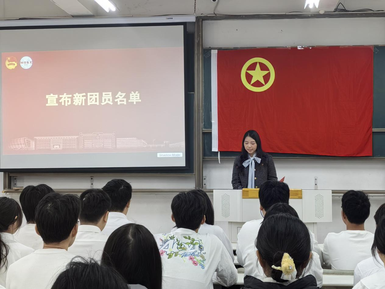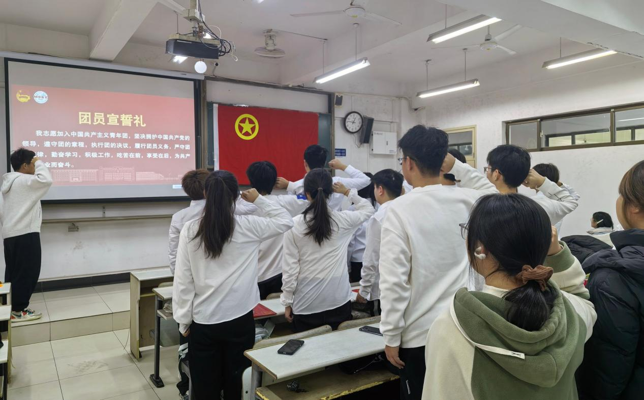 仪式在雄壮的国歌声中正式开始。李思雨宣读新团员名单,颁发团徽、团员证与团章。领誓人刘道瑞带领全体新团员庄严宣誓,誓言铿锵,展现了他们坚定的理想信念和永远跟党走的决心。新团员代表李心琪表示,这将是她人生的新起点,未来将不断提高思想觉悟,勤奋学习,积极实践,争做优秀共青团员。老团员代表傅中晨结合自身经历,鼓励新团员牢记使命、勇于担当,在学习与生活中发挥模范作用。仪式在全体齐唱《光荣啊,中国共青团》的激昂歌声中圆满结束。