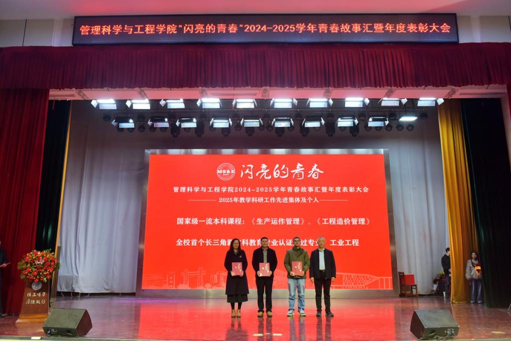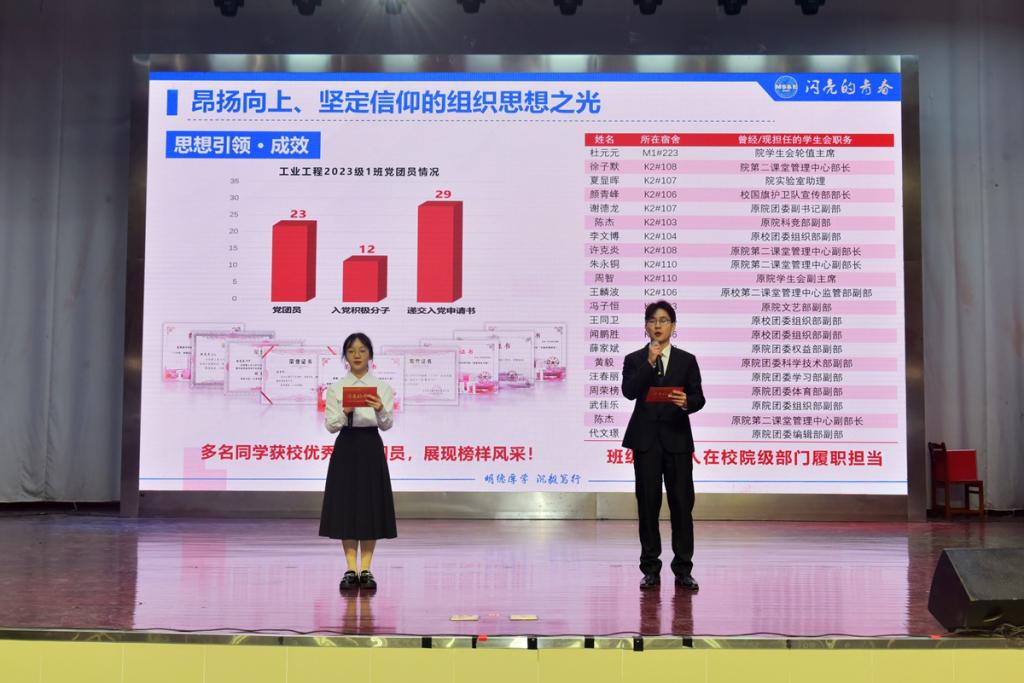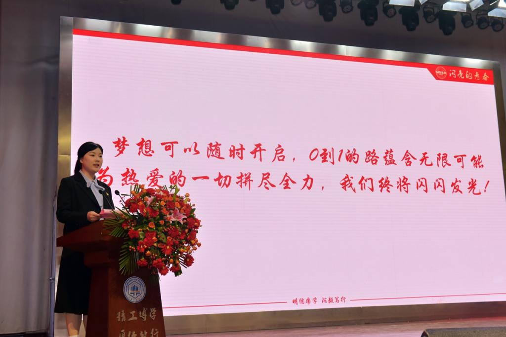 在青春故事篇章,校“十佳班级”工业工程231班学生代表杜元元、周荣榜分享了班级凝心聚力、锤炼本领的建设历程;优秀推免生代表工程造价222班台昌俊分享了自己获第十九届“挑战杯”国赛三等奖的故事,回顾了以厚学回应时代所需、以实践锻造综合素养的成长心路;省大学生体育舞蹈比赛二等奖获得者信息管理与信息系统223班汪竟彤讲述了一个体育舞蹈生从0到1的突破之路;全国大学生橄榄球赛第六名我校橄榄球队队长工业工程222班王胜尧分享了在班级、体育部与橄榄球队之间勇担责任、坚持所爱的团队故事;教师代表包菊芳以“情怀与坚守”为主题,分享了从教40年以来的感悟与初心。