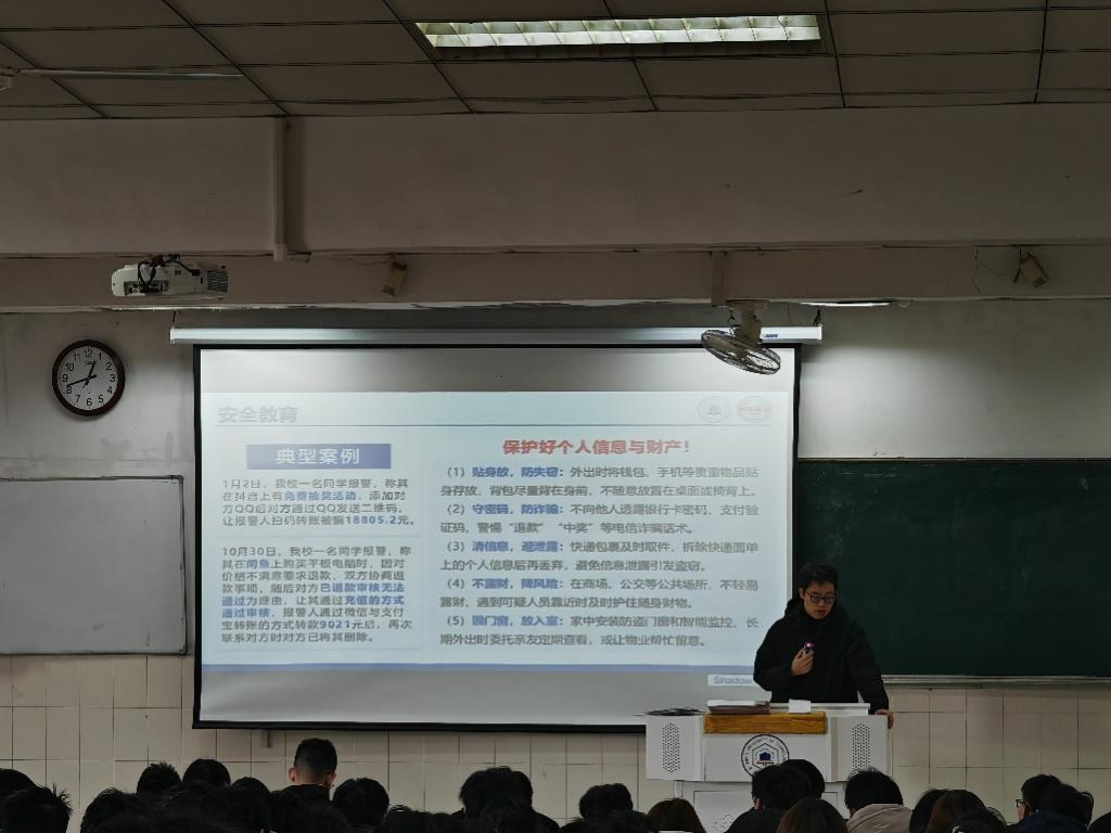 曹宇围绕网络安全、人身财产安全、消防安全等多方面开展宣传教育,结合校内外典型安全案例,剖析当前存在的各类风险隐患。他强调要重点防范网络诈骗,提醒同学们安全无小事,必须时刻保持警惕,将安全意识融入日常、化为行动,做到不刷单、不投资、不点陌生链接、文明交友,守护好个人隐私与财产安全。最后,钱丹丹提醒全体同学加强宿舍安全隐患排查和晚间零汇报、各班级主要负责人做好督促和跟进,保证班级安全管理全覆盖、落实处。