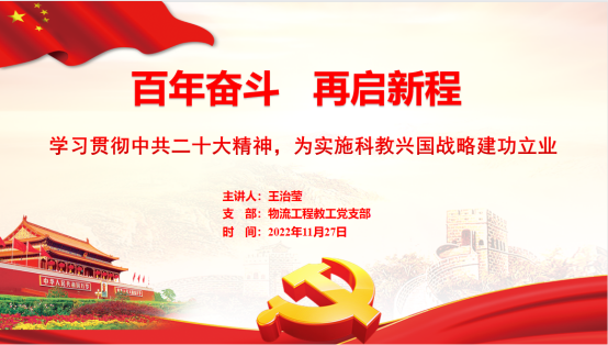 11月27日下午3:00,物流工程教工党支部在汇文楼A302东召开全体会议,党支部书记王治莹做了题为《学习贯彻中共二十大精神,为实施科教兴国战略建功立业》的专题报告,并带领全体成员认真学习领会党的二十大精神,鼓励全体成员在自身岗位上建功立业。集中学习结束后展开了热烈的小组讨论。大家一致认为,习近平总书记在党的二十大报告中所强调的“实施科教兴国战略,强化现代化建设人才支撑”是我们全面建设社会主义现代化国家、全面推进中华民族伟大复兴的重大战略部署。教育是全面提升国家科技创新能力和水平的重要基石,高等教育更是人才培养的重要阵地,我们必须立足当今中国时代发展特征和阶段性特点,深刻领会党的二十大提出的科教兴国战略的重大意义,在自身岗位上以身示范教书育人,为国家培育更多全面建设社会主义现代化国家所需的各类人才,为中华民族伟大复兴提供高质量的科教资源支持。物流工程教工党支部全体成员必将集全体之力,按照党的二十大的系统部署,立足自身岗位推动高质量实施科教兴国战略的实施。