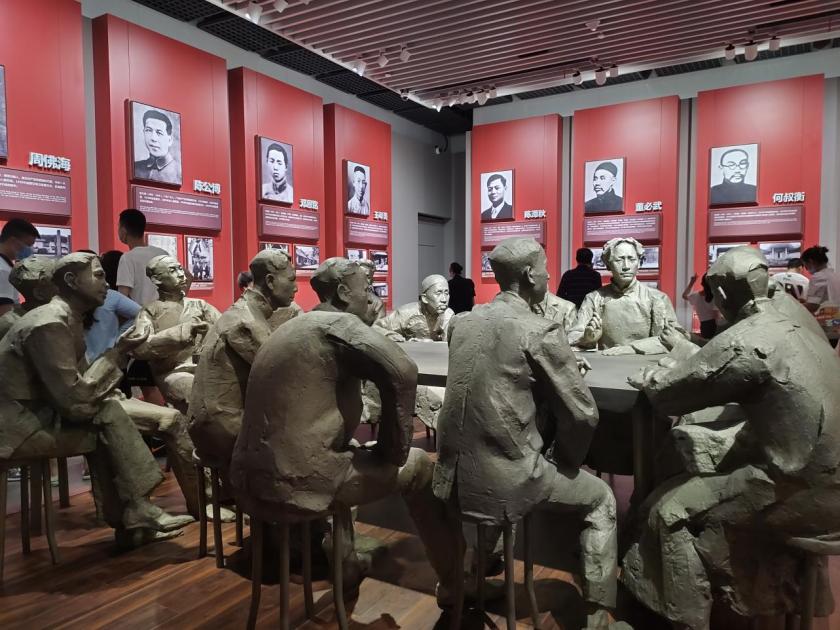 推开纪念馆厚重的大门,走入这一百年前伟大的开端。宽敞的前厅,正前方中间照壁为“日出东方——从石库门到天安门”历史组画,上海、南湖、井冈山、瑞金、遵义、延安、西柏坡、北京……一个个光辉的红色地标,再现了中国共产党苦难辉煌的历史征程。左右两侧,分别是展现长江三峡及黄河壶口瀑布景观的“中流砥柱”,以及反映长城壮丽景象的“民族脊梁”。13名中共一大代表挺拔站立的群体铜像,拉开了“伟大的开端——中国共产党创建历史陈列”展览的大幕。