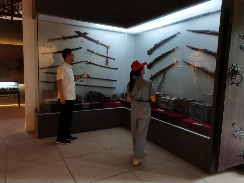 图为工作人员为实践队员介绍新四军作战时所用的武器装备。
