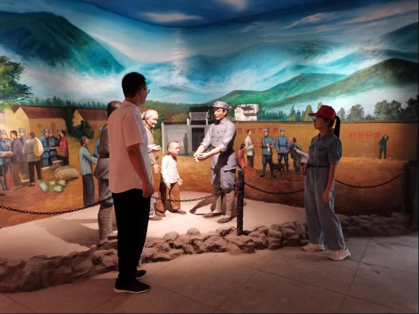图为工作人员为实践队员介绍新四军与群众鱼水相依的场景。
