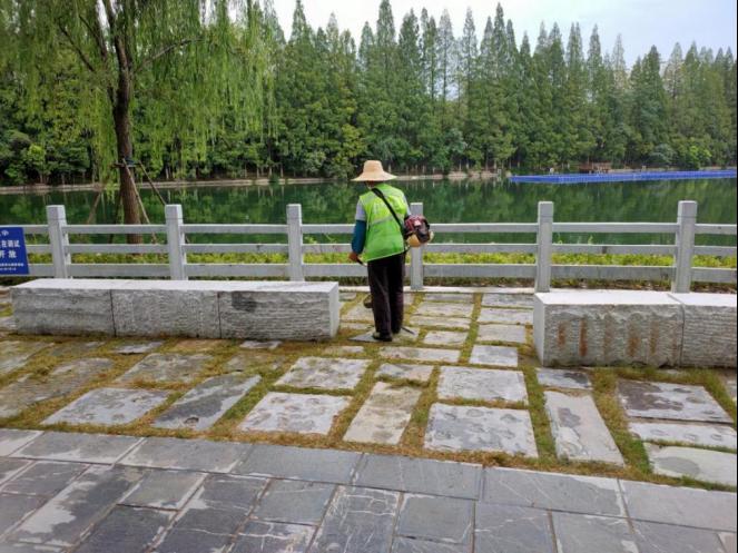 图为环卫工作人员在除杂草。