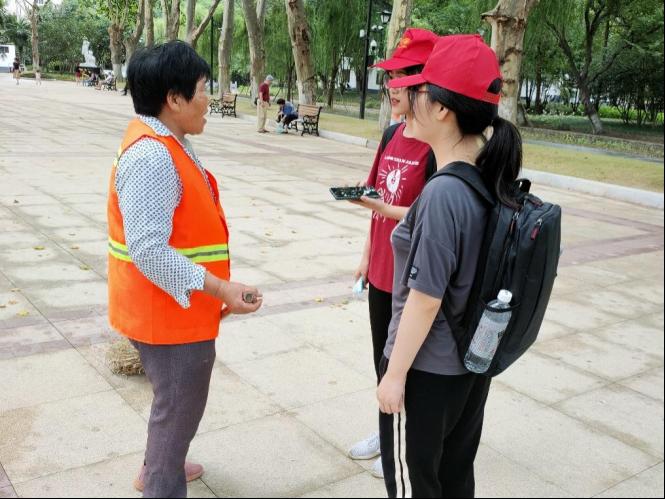 图为实践队员向环卫工人了解公园垃圾分类情况。
