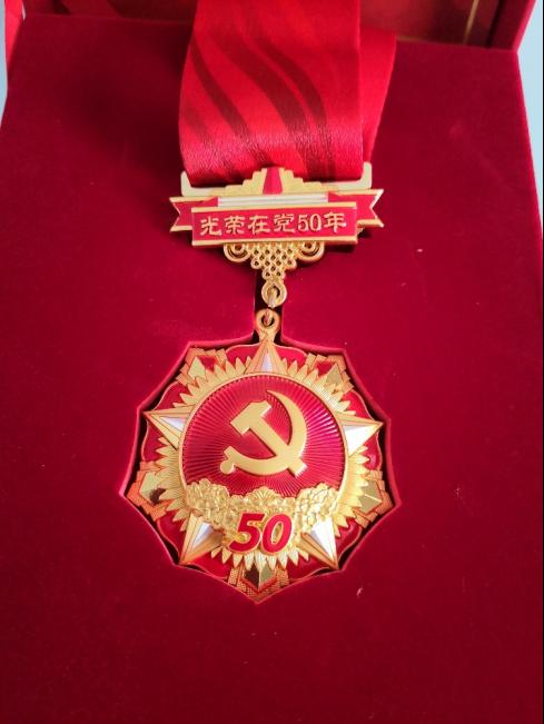 图为老党员马志美佩戴“在党五十年”纪念徽章的照片。