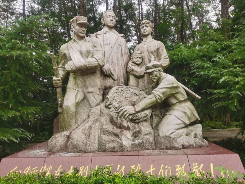 图为大别山烈士陵园革命烈士纪念雕像。雕像中间为安徽省第一任书记王步文烈士,右侧为其夫人原安徽省政协副主席方启坤,两侧为红军老兵。