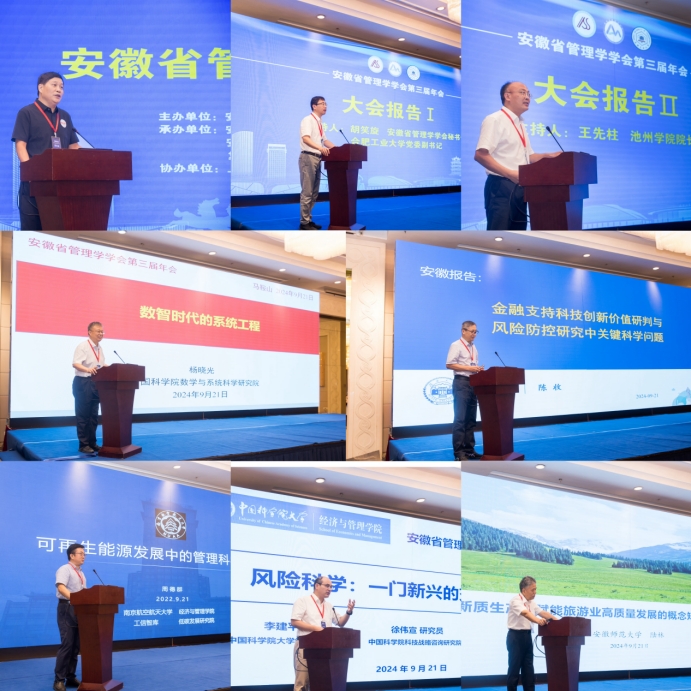 大会报告环节由合肥工业大学党委副书记胡笑旋教授和池州学院院长王先柱教授分别主持。中国科学院数学与系统科学研究院杨晓光研究员,湖南大学原副校长陈收教授,南京航空航天大学周德群教授,中国科学院大学李建平教授,安徽师范大学原副校长陆林教授分别作了题为“数智时代的系统工程”、“金融支持科技创新价值研判与风险防控研究中的关键科学问题”、“可再生能源发展中的管理科学问题”、“风险科学:一门新兴交叉科学”、“新质生产力赋能旅游业高质量发展的概念矩阵与研究展望”的大会报告。