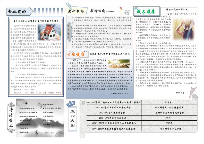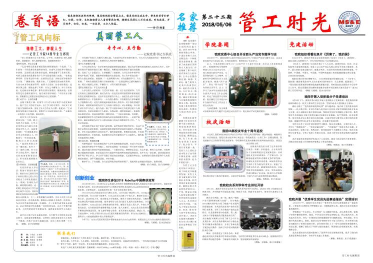 管工时光为鉴黄师 院报宣传平台,负责学院传统媒体报纸的编辑、策划与排版,以月刊、半月刊的形式对鉴黄师 近期重大活动事件进行综合报道,同时根据国家实事推出专刊。特设诗话管工环节,鼓励学生原创诗歌投稿,激发学生创作热情。以下为管工时光第二十二期第一、二版。