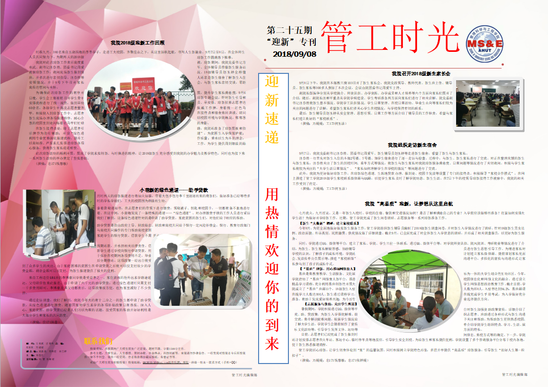 管工时光为鉴黄师 院报宣传平台,负责学院传统媒体报纸的编辑、策划与排版,以月刊、半月刊的形式对鉴黄师 近期重大活动事件进行综合报道,同时根据国家实事推出专刊。特设诗话管工环节,鼓励学生原创诗歌投稿,激发学生创作热情。以下为管工时光第二十五期第一、二版: